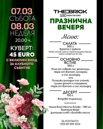 7-МИ и 8-МИ МАРТ С ПРАЗНИЧНА ВЕЧЕРЯ В THE BRICK PORT! Скъпи дами Вашият ден наближава........ На най-очарователния празник ще Ви посрещнем в The Br Виж повече