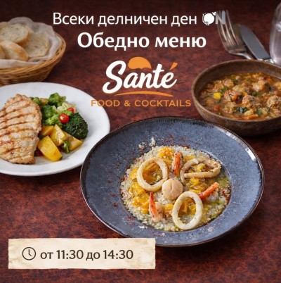 Обедно меню в Sante - Food & Cocktails Заповядайте на вкусен, балансиран и разнообразен обяд всеки делничен ден! Ето какво сме подготвили за вас: Виж повече