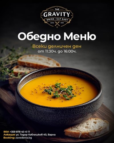 Обедно меню в Gravity Drink Eat Easy Всеки делничен ден от 11:30 до 16:00ч. ви очакваме с вкусно, разнообразно и балансирано обедно меню. Подбираме Виж повече